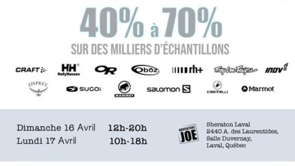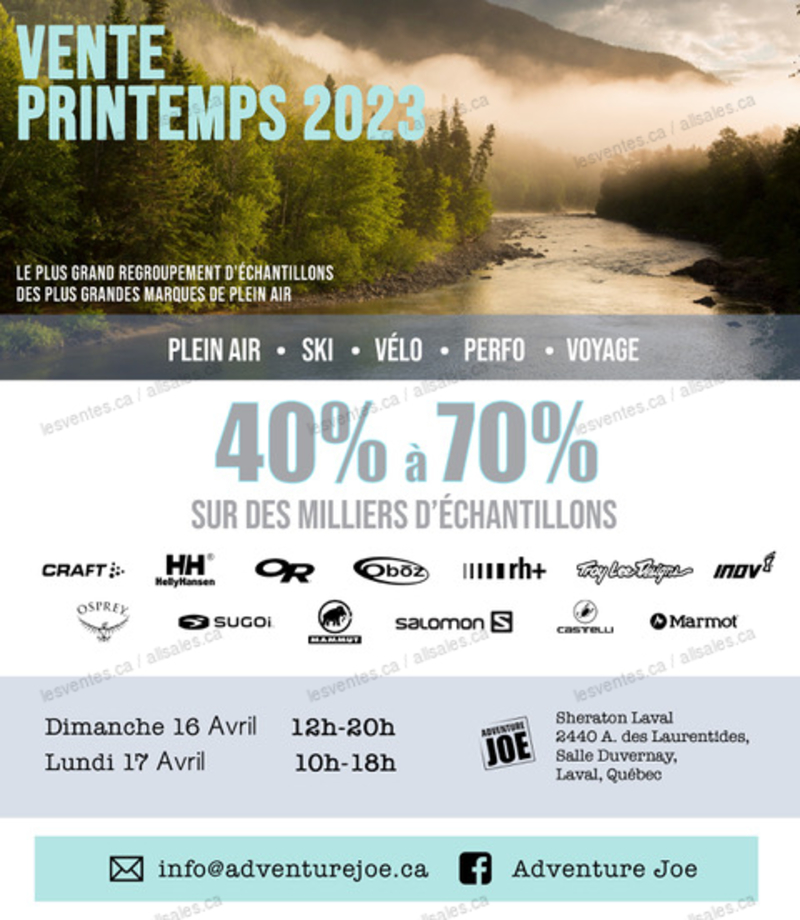 Vente printemps 2023 Joe Aventure les 16-17 avril! Économisez de 40% à 70% sur des vêtements, chaussures, équipement et accessoires de vélo et plein air. Marmot, Craft, Helly Hansen, OR, Castelli, Osprey, Oboz, Inov, Sugoi, rh+, Salomon, Mammut.