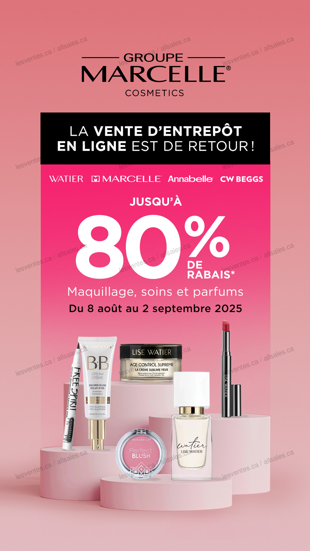 C'est le retour de notre vente d’entrepôt en ligne jusqu'au 2 septembre! Jusqu'à 80% de rabais! Magasinez des produits de vos marques canadiennes préférées: Lise Watier, Marcelle, Annabelle & CW Beggs and Sons.