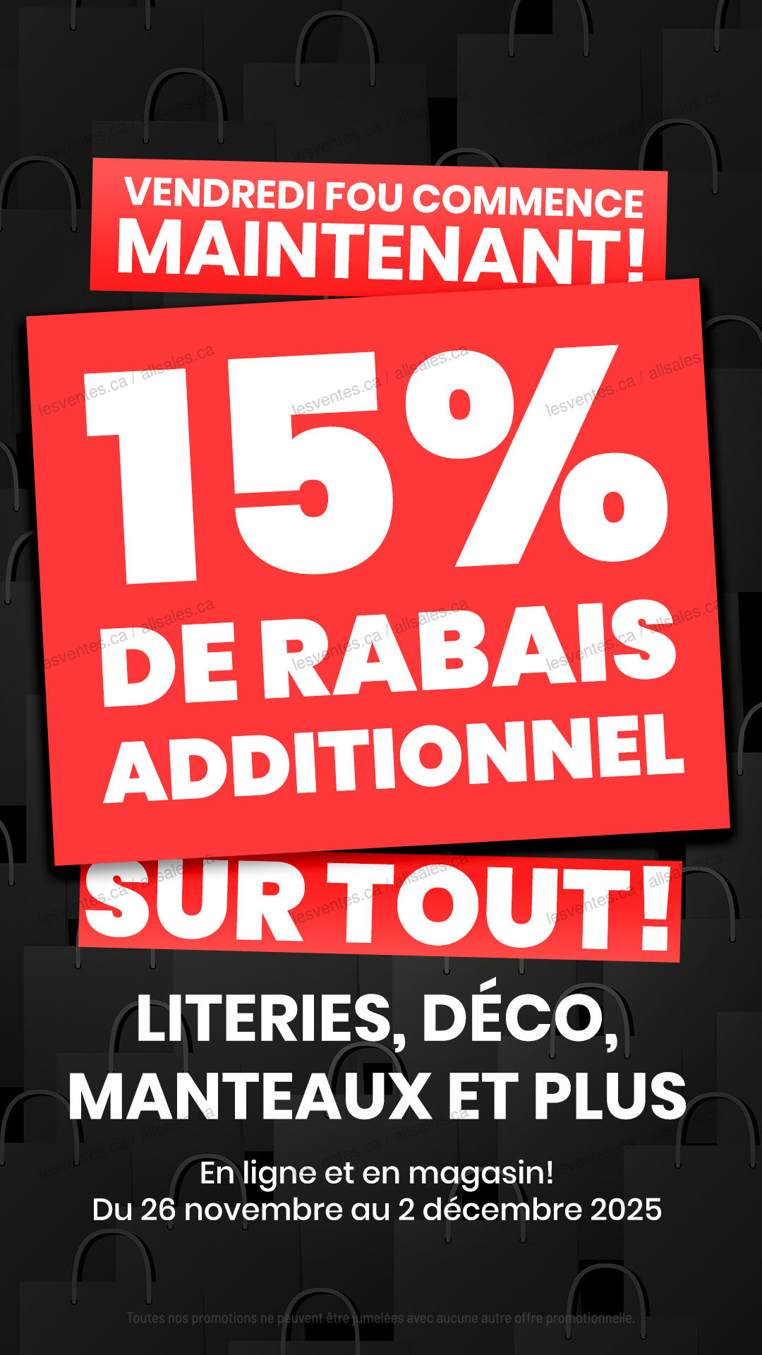 Magasinez votre literie chez Méga vente durant le Vendredi Fou et obtenez 15% de rabais additionnel sur des articles déjà réduits! Courtepointes, ensembles de douillette 2-3 mcx, 5 mcx et 6-8 mcx. Drapas bambou comfort plus, oreilles de bambou.