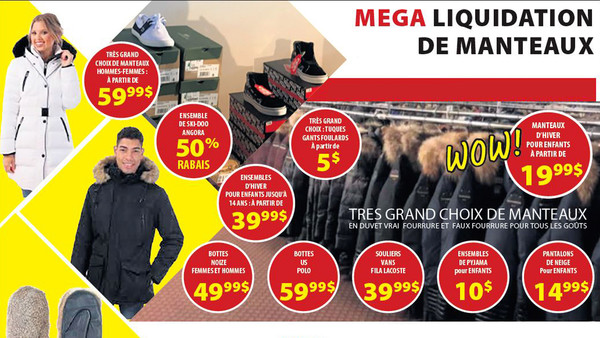 Méga liquidation de manteaux, 4 jours seulement, les 11-12-13-14 janvier! Très grand choix de manteaux homme & femme à partir de 59,99$. Habits neige enfant jusqu'à 14 ans à partir de 39,99$, manteaux 19,99$+. Noize, Dex, Ookpik, Gusti, Blizz et +