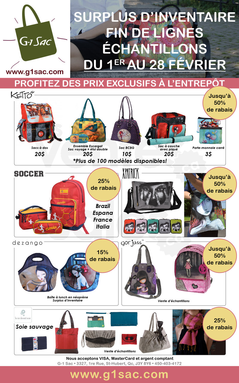 Sac à main, sac à bandoulière, sac à dos, trousse à cosmétique, porte-monnaie, boîte à lunch, sac à couche, sac à portable, étui à crayons... Prix d’entrepôt jusqu’à 50% de rabais. Collections Kettö, dezango, Gorjuss, XPatrick, La vie devant soie.