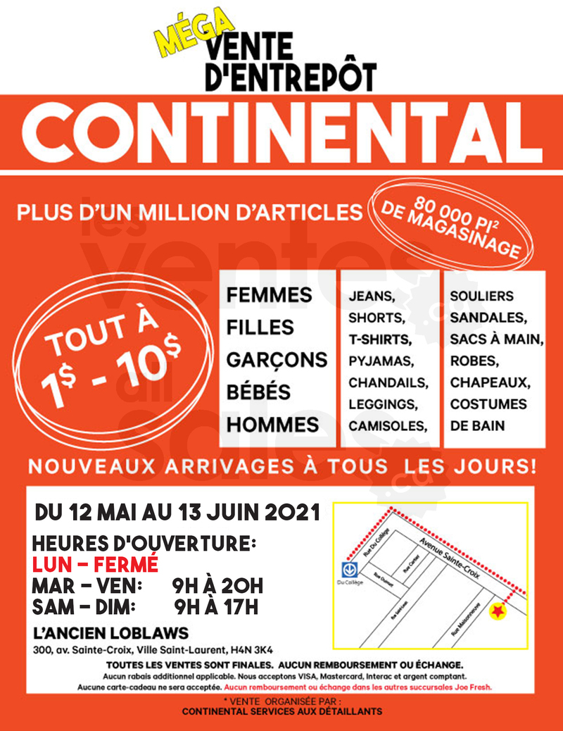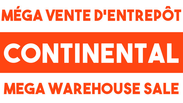 Méga vente d’entrepôt Continental depuis le 12 mai 2021. Plusieurs articles sont réduits à des prix incroyables! Tout à 1$ à 10$ .Venez nous voir!