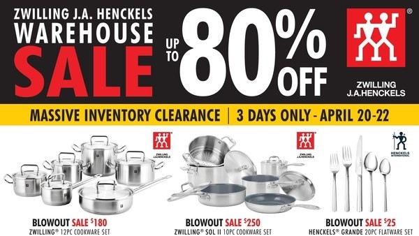 Vente d'entrepôt de Zwilling J.A. Henckels du 20 au 22 avril à Markham! Économisez jusqu'à 80% sur les gadgets de cuisine, couteaux, coutellerie, ustensiles de cuisine et plus. Obtenez jusqu'à 90% de rabais sur une vaste sélection d'outils de beauté!