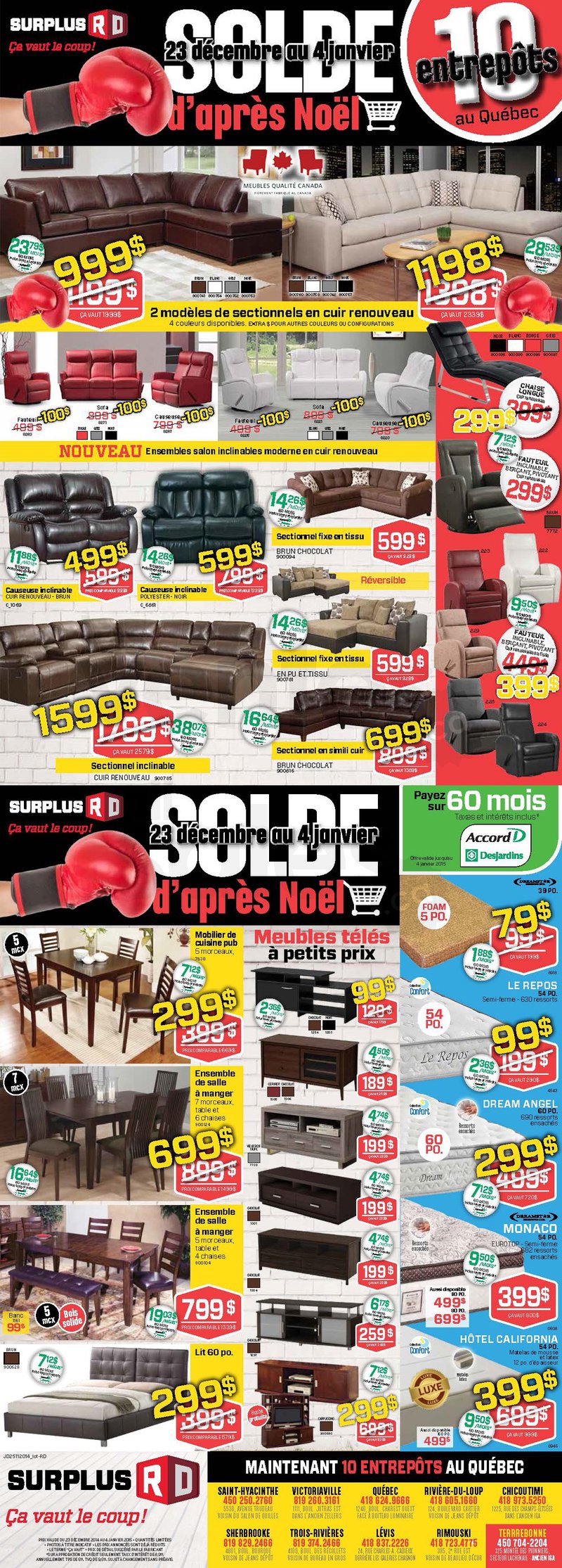 Profitez du solde d'Après-Noël chez Surplus RD pour créer un décor exceptionnel à une fraction du prix de détail. Du 26 décembre au 4 janvier, rabais supplémentaires sur sectionnels, inclinables, mobilier de salle à manger, meubles tété...