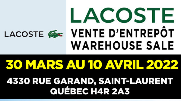 Vente d'entrepôt Lacoste du 30 mars au 10 avril 2022! Premium Retail Group vous offre aussi des rabais jusqu'à -75% sur The North Face, Helly Hansen, Oakley, Under Armour, VANS, Puma...
