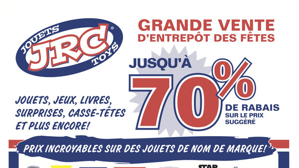 La grande vente d'entrepôt de jouets JRC est en cours! Rabais allant jusqu'à 70% sur des jeux, jouets, livres, casse-têtes, etc. Pat'Patrouille, Vtech, Fisher Price, Melissa & Doug, Star Wars, Disney, Mega Bloks, Nerf, Meccano et +.
