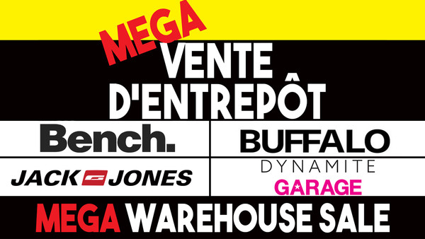 Méga vente d’entrepôt Jack & Jones, Bench, Buffalo, Garage et plus! Ouvert 7 jours semaine. Plusieurs articles seront réduits à des prix incroyables! Jusqu’à 70% de rabais. Venez nous voir!