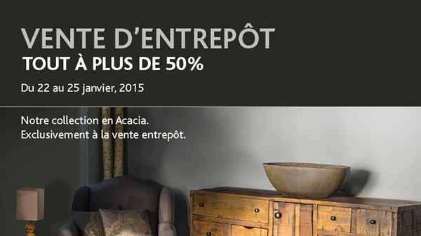 Artemano mobilier de bois exotique, vente d’entrepôt 4 jours seulement, du 22 au 25 janvier. Plus de 50% de rabais sur toute la marchandise, meubles et objets de décoration.