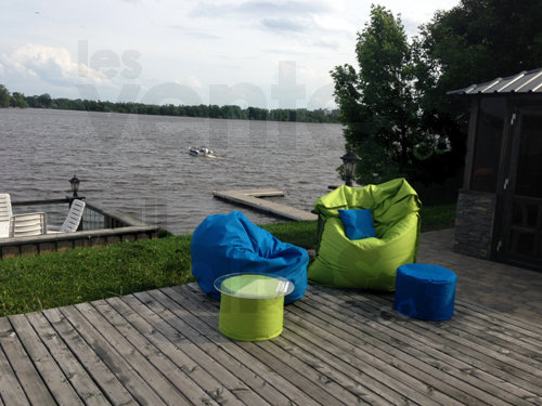 Soyez prêts pour le retour du beau temps! Découvrez nos OUTBAGS (mc) au super prix de 175$ (tissus unis) et 195$ (tissus à motifs). Également disponible pour l'extérieur : fauteuil poire, pouf géant, sac poire, pouf, table et coussins en tissus.