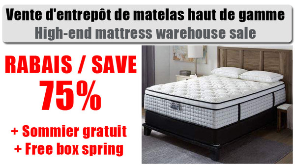Vente d’entrepôt de matelas haut de gamme et lits électriques du 21 au 23 février! Rabais 75% sur tous les matelas et tous les lits électriques. Marques: Sealy, Simmons, Kingsdown, Serta, etc. Sommier gratuit avec chaque matelas acheté.