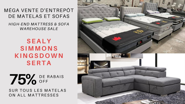 Besoin d'un nouveau sofa ou d'un matelas? Profitez de la grande vente de liquidation chez SD Discount! Rabais 75% sur tous les matelas: Sealy, Simmons, Kingsdown, Serta, etc. Liquidation de sofas & sectionnels en quantité limitée, dépêchez-vous!