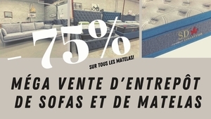 SD Discount vous offre 75% de rabais sur votre nouveau matelas! OUI OUI! Grandes marques telles que Sealy, Simmons, Kingsdown, Serta, etc. Profitez de notre liquidation de sofas & sectionnels!