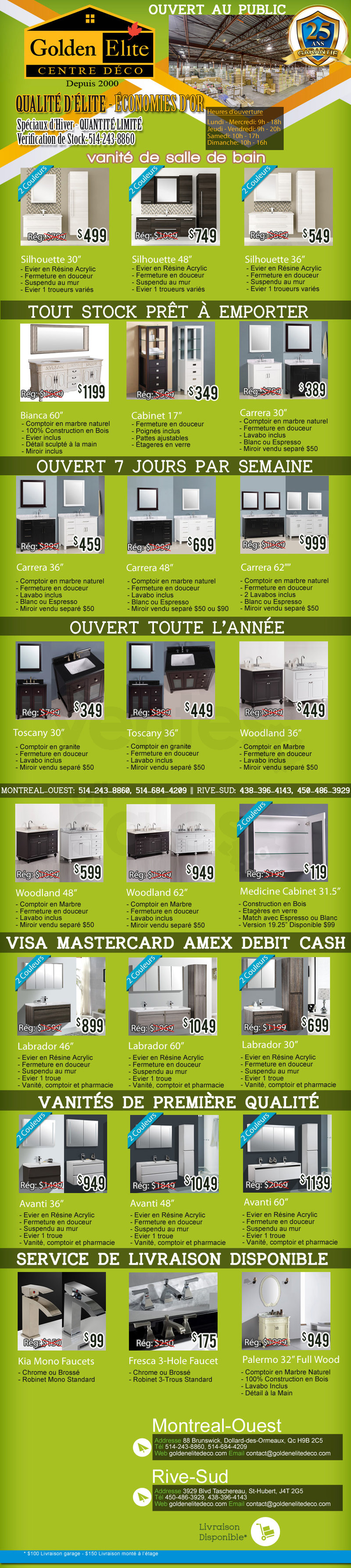 Planchers, vanités, portes, cuisines, mosaïques, marbres... Tous les produits sont de haute qualité avec garantie. Bénéficiez des prix de liquidation d'hiver dans les Centres Déco Golden Elite.