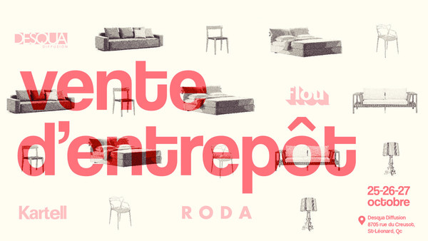 Vente d’entrepôt chez DESQUA DIFFUSION, une entreprise spécialisée dans la distribution de mobiliers italiens haut de gamme. Vous pourrez y retrouver les magnifiques lits FLOU, la célèbre marque KARTELL et les meubles extérieurs RODA.