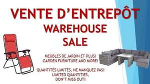 Vente d'entrepôt de meubles de jardin, les 28-29 mai et 3-4 juin! Venez profiter de nos meilleurs prix de la saison sur les ensembles de patio, meubles de jardin, hamacs, fauteuils, causeuses d'extérieur, gazebos, etc.