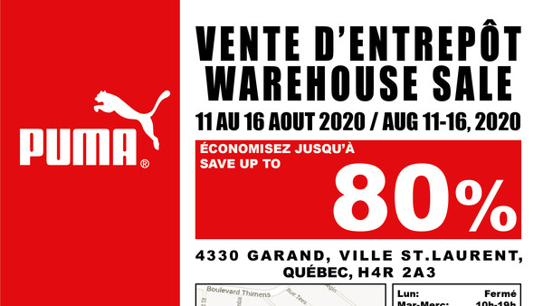 Ne manquez pas la méga vente d'entrepôt Premium Retail Group du 11 au 16 août 2020 à Montréal! Économisez jusqu'à 80% sur des vêtements et chaussures Puma pour hommes, femmes et enfants!