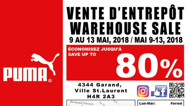 Ne manquez pas la méga vente d'entrepôt Premium Retail Group du 9 au 13 mai 2018 à Montréal! Économisez jusqu'à 80% de rabais sur les vêtements et chaussures Puma pour hommes, femmes et enfants!