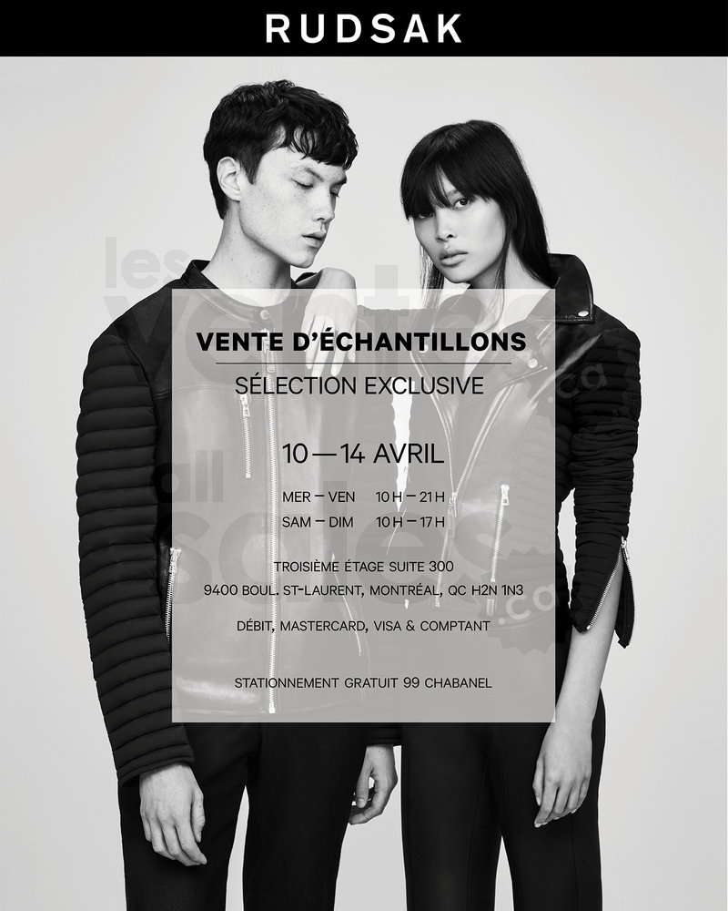 Vente d'échantillons RUDSAK du 10 au 14 avril! Notre plus importante à ce jour! Sélection exclusive de manteaux, vestes en cuir, sacs et + pour femmes et hommes. Nouveaux arrivages tous les jours.