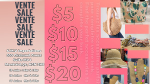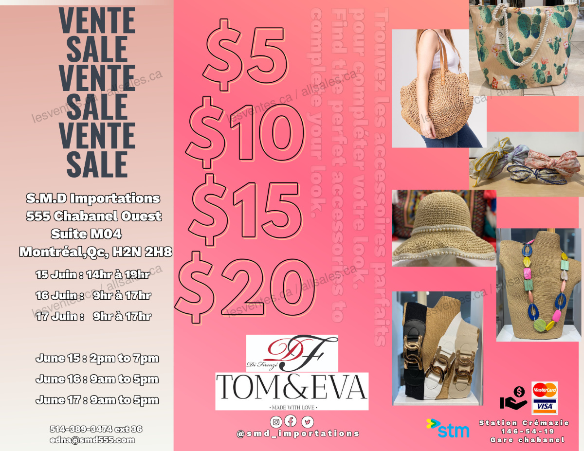 Vente S.M.D. Importations, 3 jours seulement, les 15-16-17 juin 2022. Trouvez les accessoires parfaits pour compléter votre look à 5$-10$-15$-20$. Dépêchez-vous, ne manquez pas cette occasion!