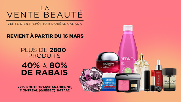 La Vente Beauté est une vente d’entrepôt par L’Oréal Canada qui se tient plusieurs fois par année. Vous y trouverez plus de 2800 produits et des marques comme YSL, Lancôme, Biotherm, Matrix, Maybelline, L’Oréal Paris...