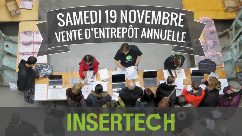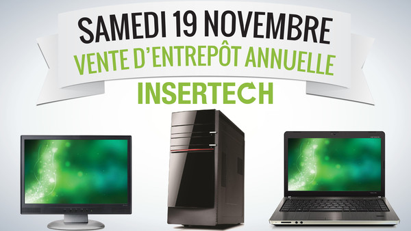 Insertech tiendra sa vente d’entrepôt annuelle ce samedi le 19 novembre 2016 de 9h à 15h . Nous avons plus de 1300 ordinateurs reconditionnés à partir de 75$, écrans d'ordinateurs à partir de 15$ et laptops à partir de 125$. Prix nets, pas de taxes.