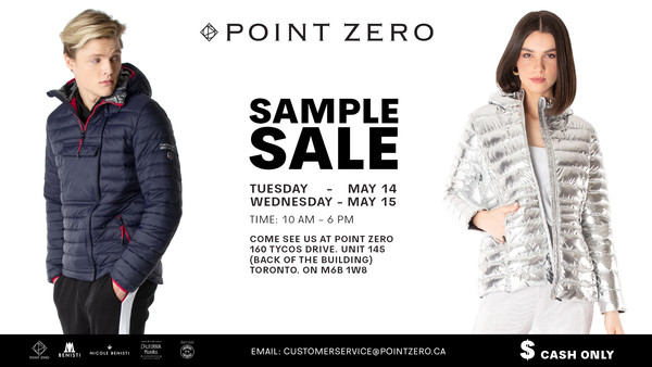 Vente d'entrepôt Point Zero à Toronto les 14 & 15 mai 2019! Des rabais incroyables sur un vaste choix de vêtements pour hommes et femmes. Bon shopping!