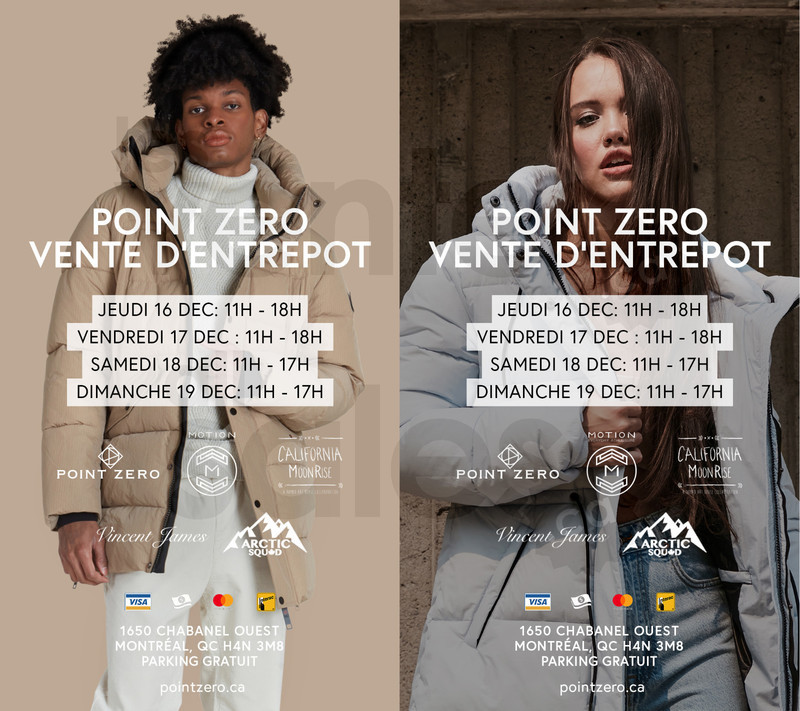 La vente d'entrepôt Point Zero est de retour à Montréal du 16 au 19 décembre 2021! Profitez de rabais jusqu’à 70% sur un vaste choix de vêtements pour hommes et femmes!