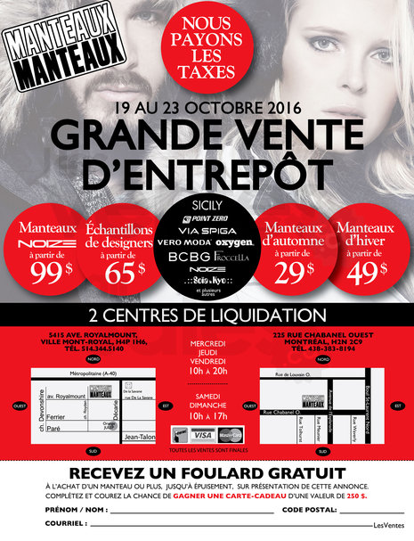 Grande vente d'entrepôt Manteaux Manteaux du 19 au 23 octobre. Manteaux hommes & femmes : Sicily, Point Zero, Vero Moda, BCBG, Noize, Soïa & Kyo et plus! Manteaux d'automne à partir de 29$, manteaux d'hiver à partir de 49$! Nous payons les taxes!
