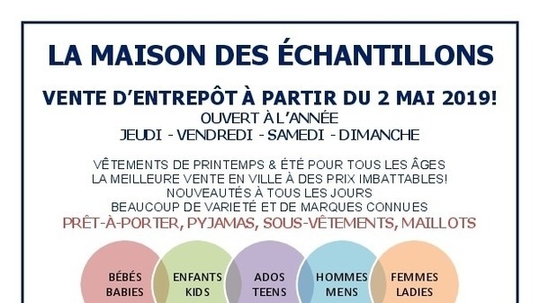 Vente d'entrepôt La maison des échantillons à partir du 2 mai 2019! La meilleure vente en ville, des prix imbattables, vêtements printemps/été pour toute la famille. Grande variété & marques connues: prêt-à-porter, pyjamas, sous-vêtements, maillots!