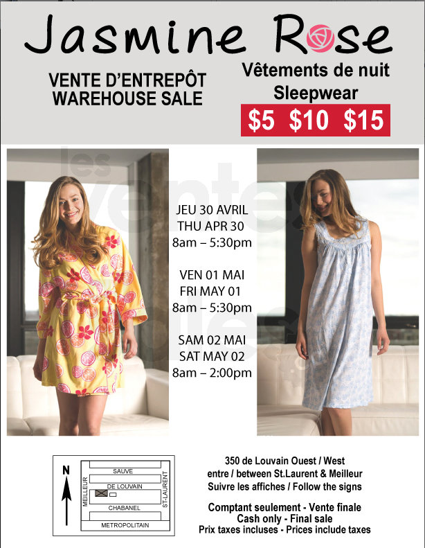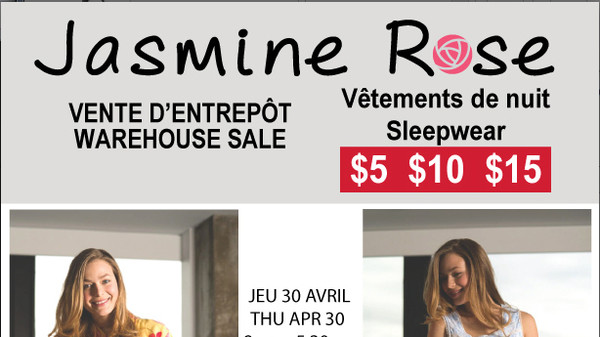 Grande vente d'entrepôt du 30 avril au 2 mai, venez profiter de super aubaines sur nos peignoirs et vêtements de nuit Jasmine Rose à 5$, 10$ et 15$. Toutes les ventes sont finales. Les taxes sont incluses dans les prix.
