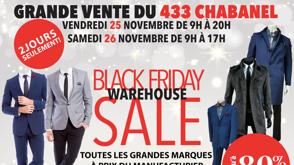 Grande vente du 433 Chabanel les vendredi 25 novembre & samedi 26 novembre! Vêtements de grandes marques pour hommes et garçons (taille plus) au prix du manufacturier! Jusqu'à 80% de rabais sur manteaux, chemises, habits, pantalons, chandails & plus!
