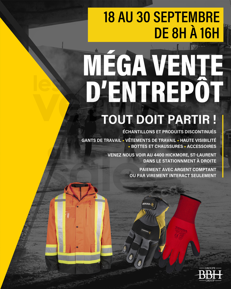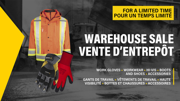 Grande vente d'entrepôt! Variété d’échantillons et de produits discontinué de marques Horizon, Terra, Dickies, Holmes Workwear...Gants, manteaux, vestes, ensembles de pluie et bien plus seront disponibles.