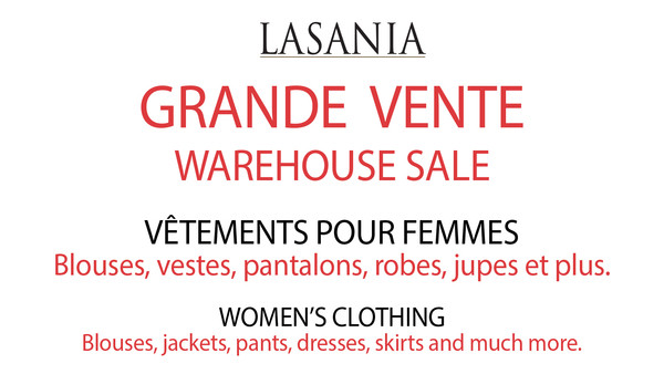 Grande vente de vêtements pour femmes Lasania à Montréal du 31 octobre au 3 novembre! Vêtements mode de coupe tendance dans des tissus facile d’entretien. Blouses, vestes, pantalons, robes, jupes & plus. Une occasion pour renouveler votre garde-robe!