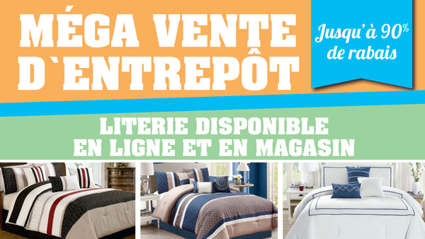 Grande vente de literie chez Méga vente d'entrepôt! Rabais jusqu'à 90%. Courtepointes 29$ et +, housses de couette 3 mcx à 25$, ens. douillette enfants à partir de 34$, couvre-matelas à partir de 34$, oreiller bambou à partir de 15$, draps à 22$.