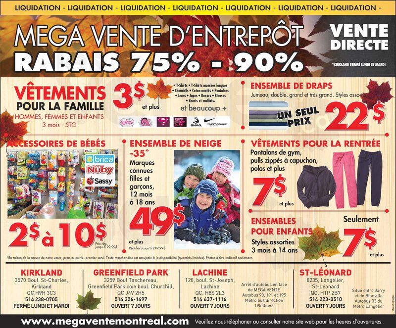 Économisez de 75 à 90% chez Méga Vente d'Entrepôt! Habits de neige Gusti, Pinzel etc. 49$ et plus, vêtements pour tous à partir de 3$, pantalons de gym, ensembles pour enfants et polos 7$ & plus, accessoires de bébé 2$-10$, ensembles de draps 22$...