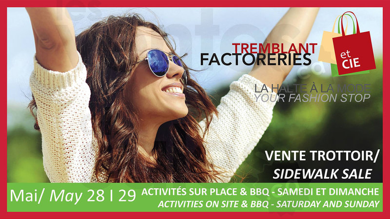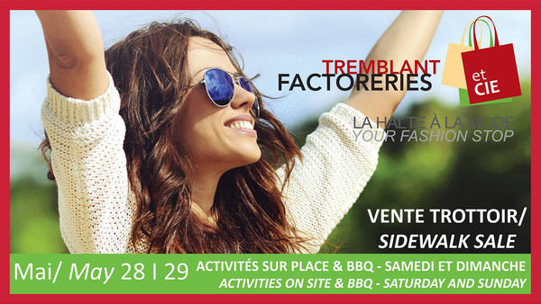 Les 28 et 29 mai, ne manquez pas la vente trottoir des Factoreries Tremblant. Jeux gonflables, activités et barbecue sur place. On vous y attend en grand nombre, invitez vos familles et amis!