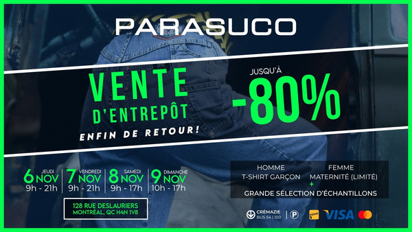 Notre fameuse Vente d’entrepôt est de retour! Du 6 au 9 novembre, profitez de -80% sur une incroyable sélection pour hommes, femmes, garçons et maternité (quantités limitées), une vaste sélection d'échantillons et plus! Tous à prix imbattables! Plus