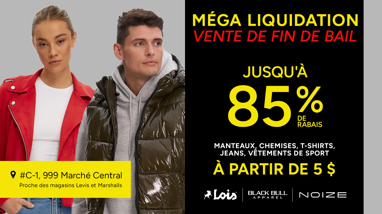 Vente de fin de bail, tout doit partir! Ne manquez pas cette vente de liquidation avec des rabais allant jusqu'à 85%. Découvrez des manteaux, chemises, t-shirts, jeans & vêtements de sports à partir de 5$. Achetez 2 jeans & recevez-en 1 gratuitement! Plus