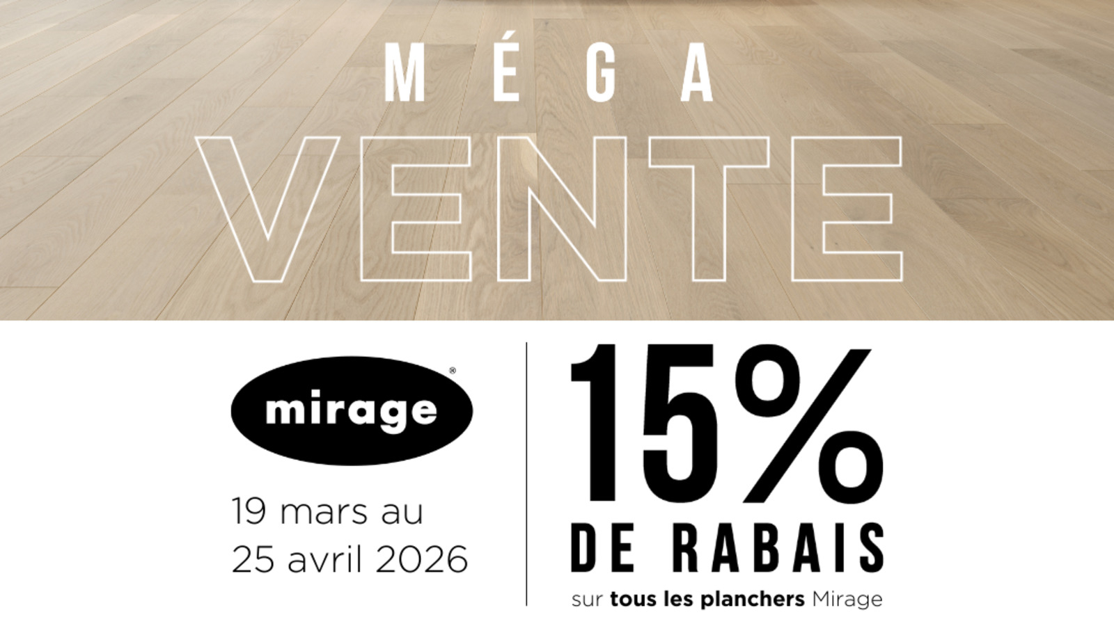 Méga vente de planchers Mirage chez Barwood-Pilon du 19 mars au 25 avril 2026! Visitez un de nos magasins et épargnez 15% sur tous les planchers de bois franc Mirage ainsi que plusieurs autres spéciaux disponibles. Plus