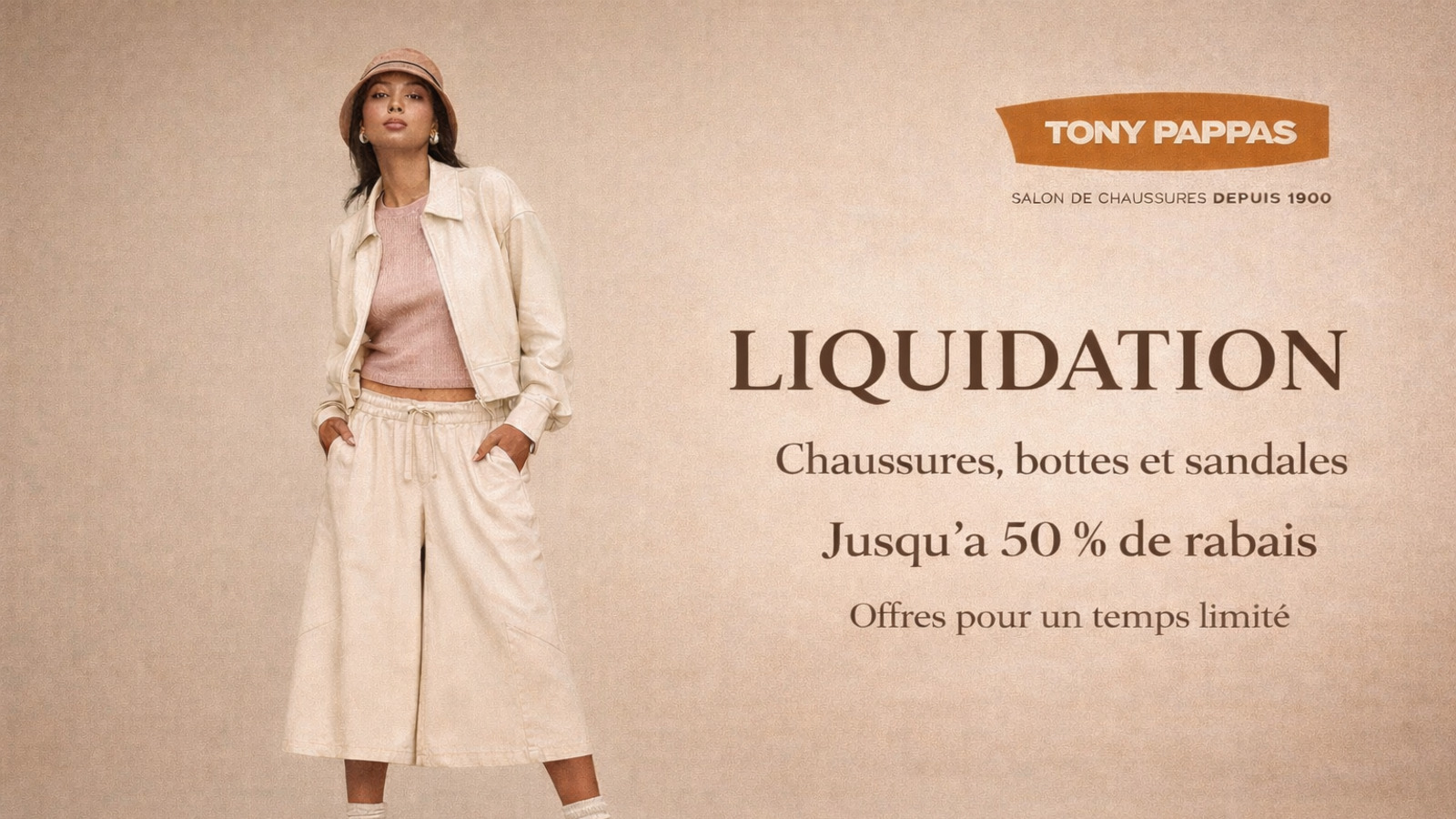 Liquidation chez Tony Pappas : des bottes, chaussures et sandales stylées à prix réduits jusqu’à -50 %! 🥳 Choisis parmi une vaste sélection pour femmes, hommes et enfants. Plus