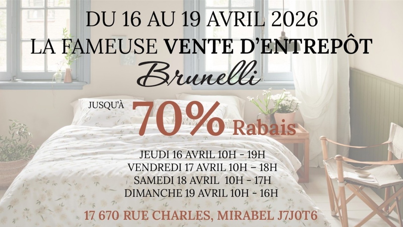 La vente d'entrepôt Brunelli s'en vient et on a vraiment hâte de vous y accueillir! Du 16 au 19 avril, on vous ouvrira nos portes pour 4 jours seulement. Housses de couette, courtepointes, coussins, jetés et plus, avec des rabais allant jusqu'à 70%. Plus