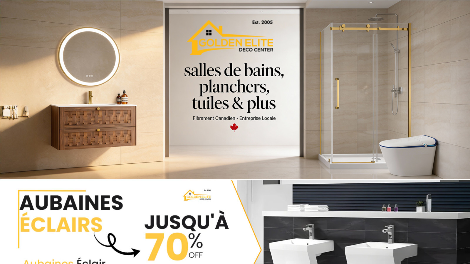 Transformez votre salle de bain à prix fou! Aubaines éclairs chez Golden Elite : jusqu’à 70% de rabais sur salles de bains, planchers et tuiles, et jusqu'à 50% sur tous les robinets. Designs haut de gamme, prix garantis. Magasinez maintenant! Plus
