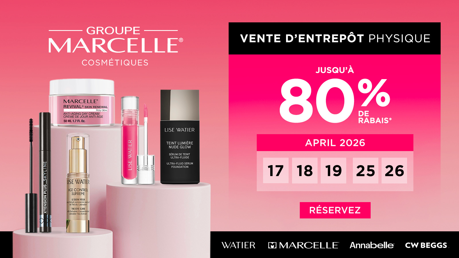 Économisez jusqu'à 80 % sur vos produits maquillage, soin et fragrance préférés à la vente physique du Groupe Marcelle, les 17-18-19-25-26 avril 2026. Cliquez sur l'image ci-dessous pour obtenir votre invitation. Plus