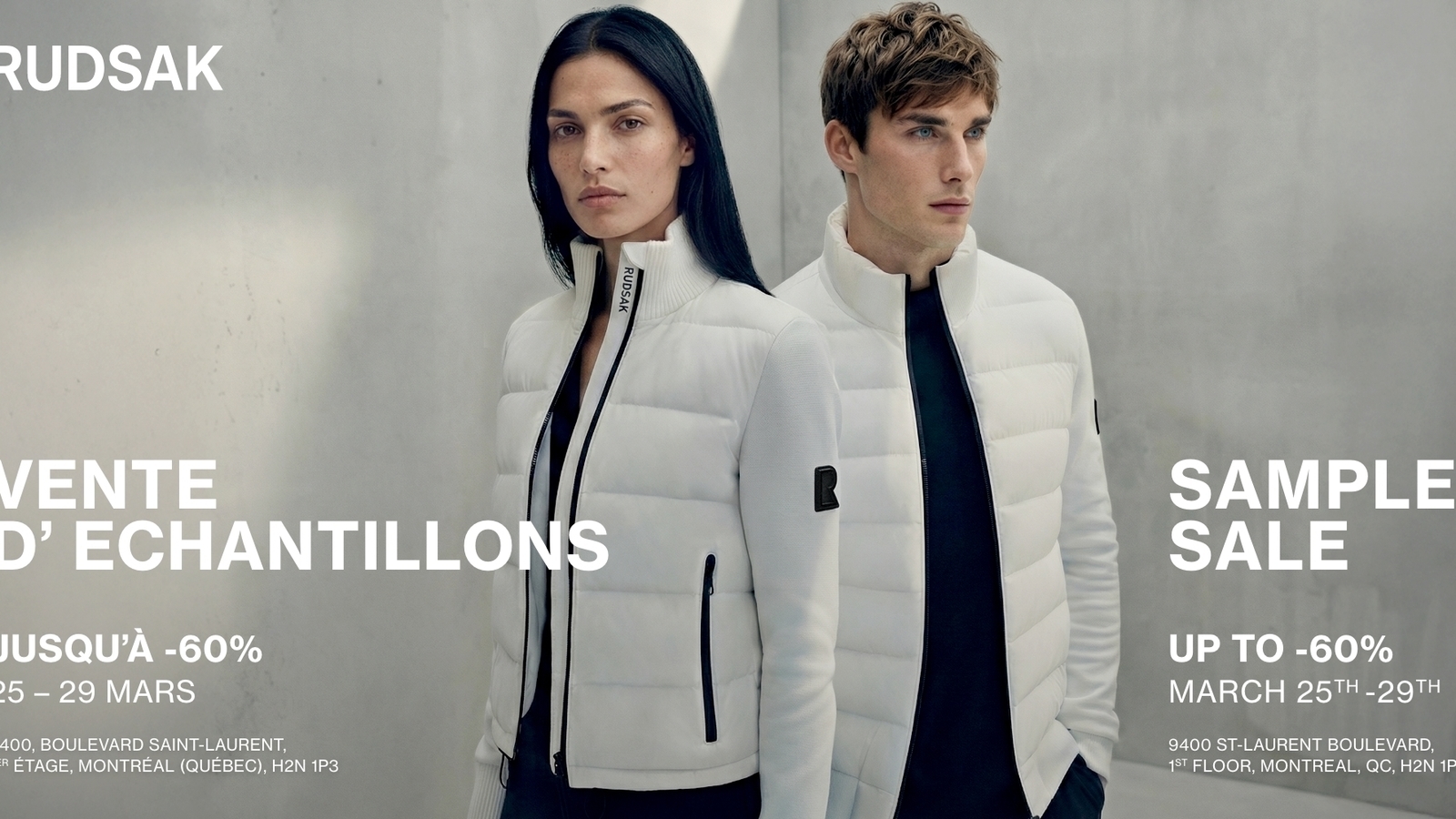 La vente d'échantillons RUDSAK est de retour! Du 25 au 29 mars 2026, venez découvrir les styles exclusifs de manteaux, vêtements et accessoires RUDSAK. Prix exclusifs, jusqu'à -60%. Styles pour hommes et femmes disponibles. Plus