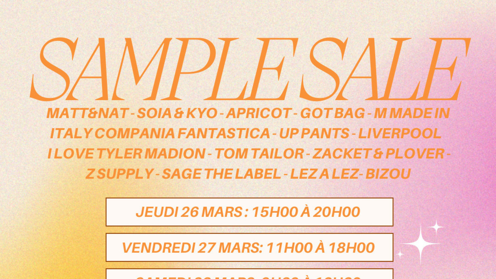 Venez découvrir nos collections d'échantillons de marques européennes haut de gamme pour femmes à jusqu'à 80% de rabais sur le prix de détail dans notre showroom de Montréal les 9 et 10 avril. Tous les modes de paiement sont acceptés. Plus