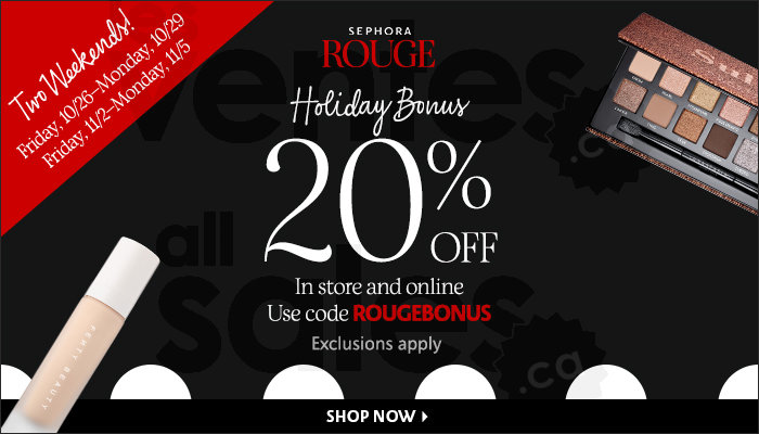 Membres Sephora Rouge, pour célébrer cette saison des fêtes, offrez-vous 20% sur vos produits Sephora préférés lors de l’événement exclusif Holiday Bonus Beauty Insider!