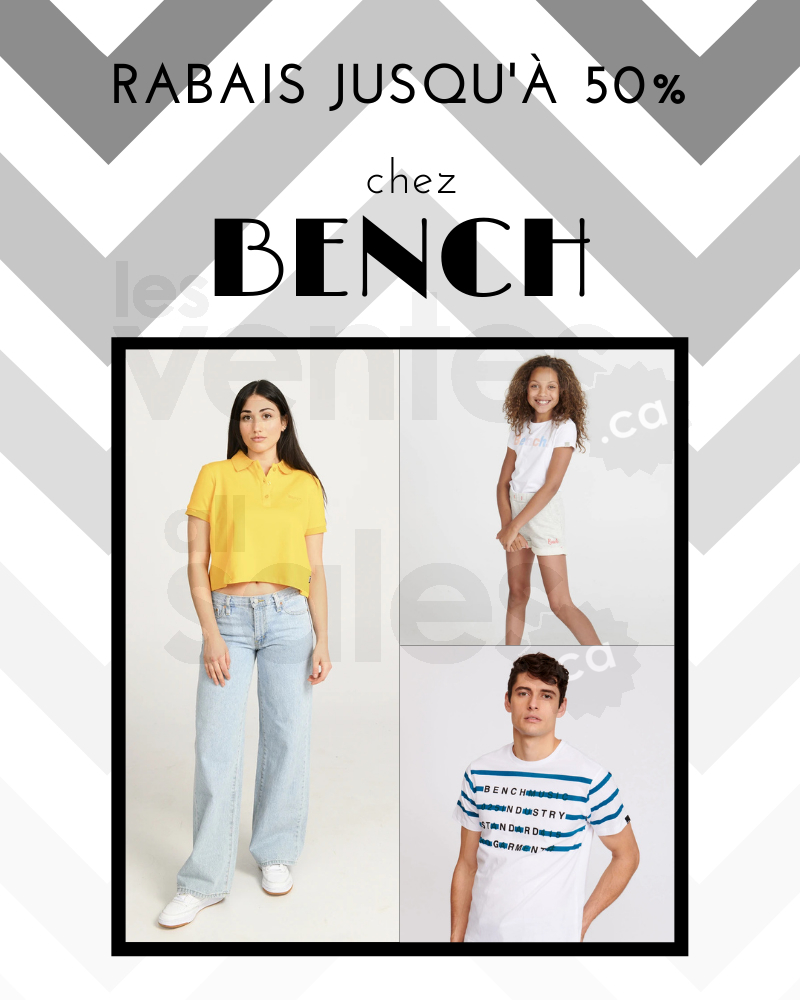Magasinez les soldes chez Bench! Économisez jusqu'à 50%: Vestes, hoodies, t-shirts, chandails, jeans, manteaux et plus.