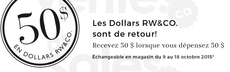 Jusqu'au 27 septembre, recevez 50$ échangeable du 9 au 19 octobre lorsque vous dépensez 50$ chez RW & Co.! Valide en magasin et en ligne, cliquez sur le visuel pour plus de détails.