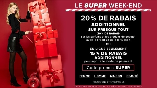 Super weekend à La Baie! Obtenez un rabais supplémentaire de 20% sur presque tout et 10% sur les cosmétiques et les parfums. En ligne seulement 15% additionnel, peu importe votre mode de paiement. Profitez-en dès maintenant!