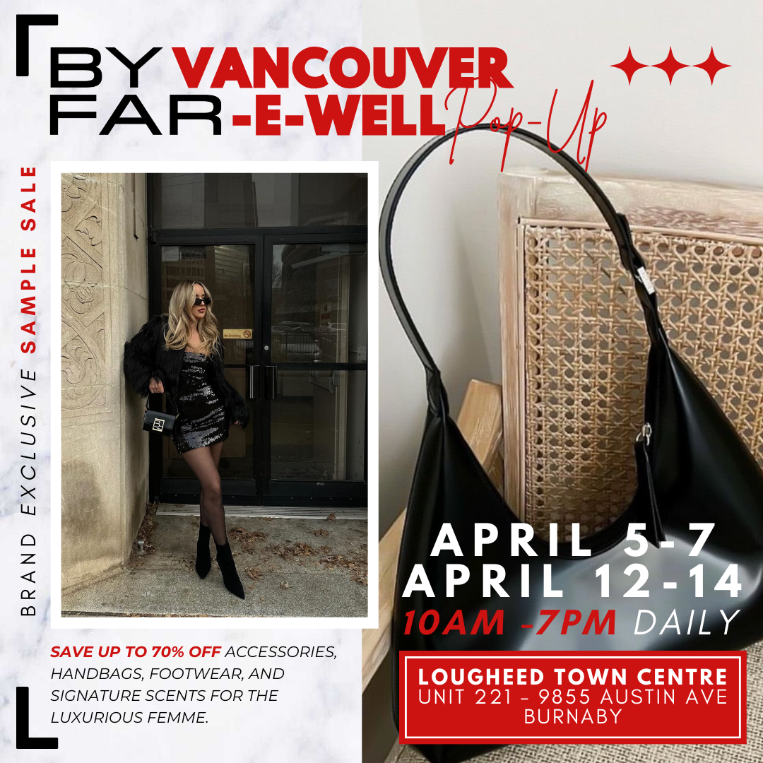 Mesdames, découvrez la vente d'échantillons BY FAR, organisée par Couture Pop Ups. Les prix varient de 45 $ à 250 $. Cet événement exclusif aura lieu du 12 au 14 avril de 10 h à 19 h au centre-ville de Lougheed, Burnaby (BC).